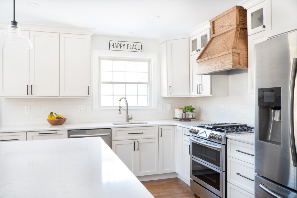 Contractor: Bearded Builders, Baltimore Cabinet Brand: Fieldstone Cabinetry Cabinet Color: Marshmallow Cream & Black Door Style: Shaker Hardware: Top Knobs:Kinney Pull, matte black Countertop: Cambria: Torquay Backsplash: White Porcelain Tile from Hunt Valley Tile Appliances: Samsung Island Seating: Home Goods Paint Color: Sherwin Williams: Silver Strand Floor Stain: Special Walnut Vent Hood: Custom Order- Etsy Photographer: Matthew Burgess Media