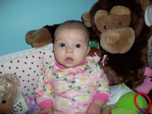 We had her 4 month check-up last week. She is doing great!! She weighs 13 lbs and 12 oz, 24 1/2 inches long and her head, it is still a little on the larger side ( who can tell, I can’t tell). She had to get 3 vaccines- boo. I think it is harder for me than it is for her. It makes me so nervous when I know she is about to get them. She is smiling at the doctors the whole time, only because she doesn’t know what is coming, but I do. Poor thing. But, She did GREAT! The first shot she didn’t make a peep, the second, she actually laughed which was weird, the third… she screamed her head off. =(. If I could have taken her to McDonald’s, I would have.