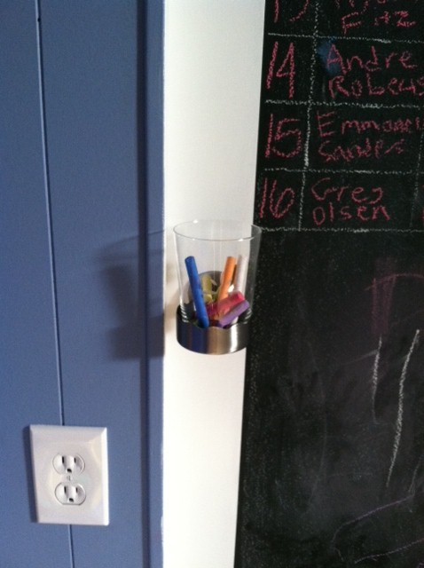 I bought this “chalk holder” at Ikea. It is actually a toothbrush holder but I thought it would be the perfect size to hold our chalk.